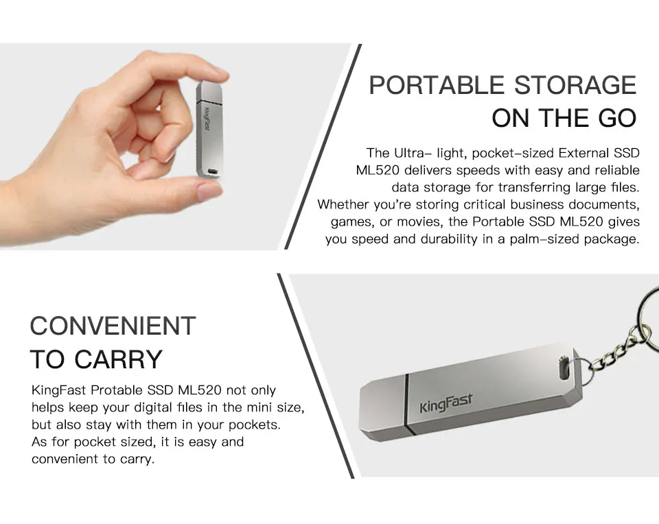 KingFast Portable SSD ML520 not only helps keep your digital files in the mini size but also stays with them in your pockets. As for pocket-sized, it is easy and convenient to carry.