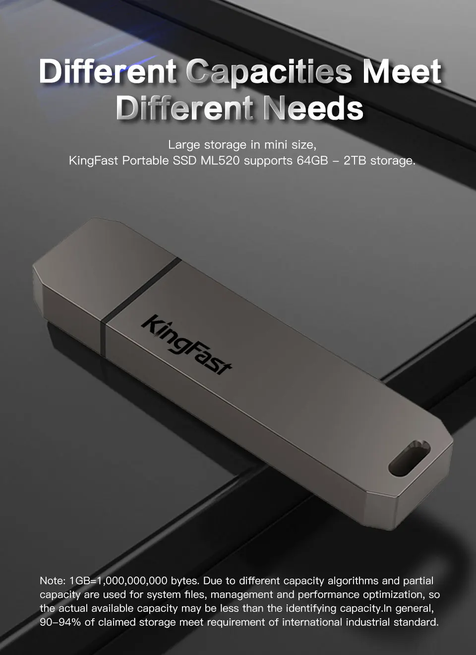 Large storage in mini size, KingFast Portable SSD ML520 supports 64GB – 2TB storage.