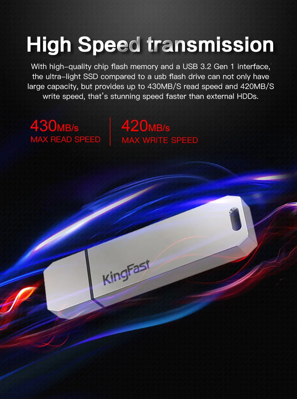 With high-quality chip flash memory and a USB 3.2 Gen 1 interface, the ultra-light SSD compared to a usb flash drive can not only have large capacity, but provides up to 430MB/S read speed and 420MB/S write speed, that’s stunning speed faster than external HDDs.