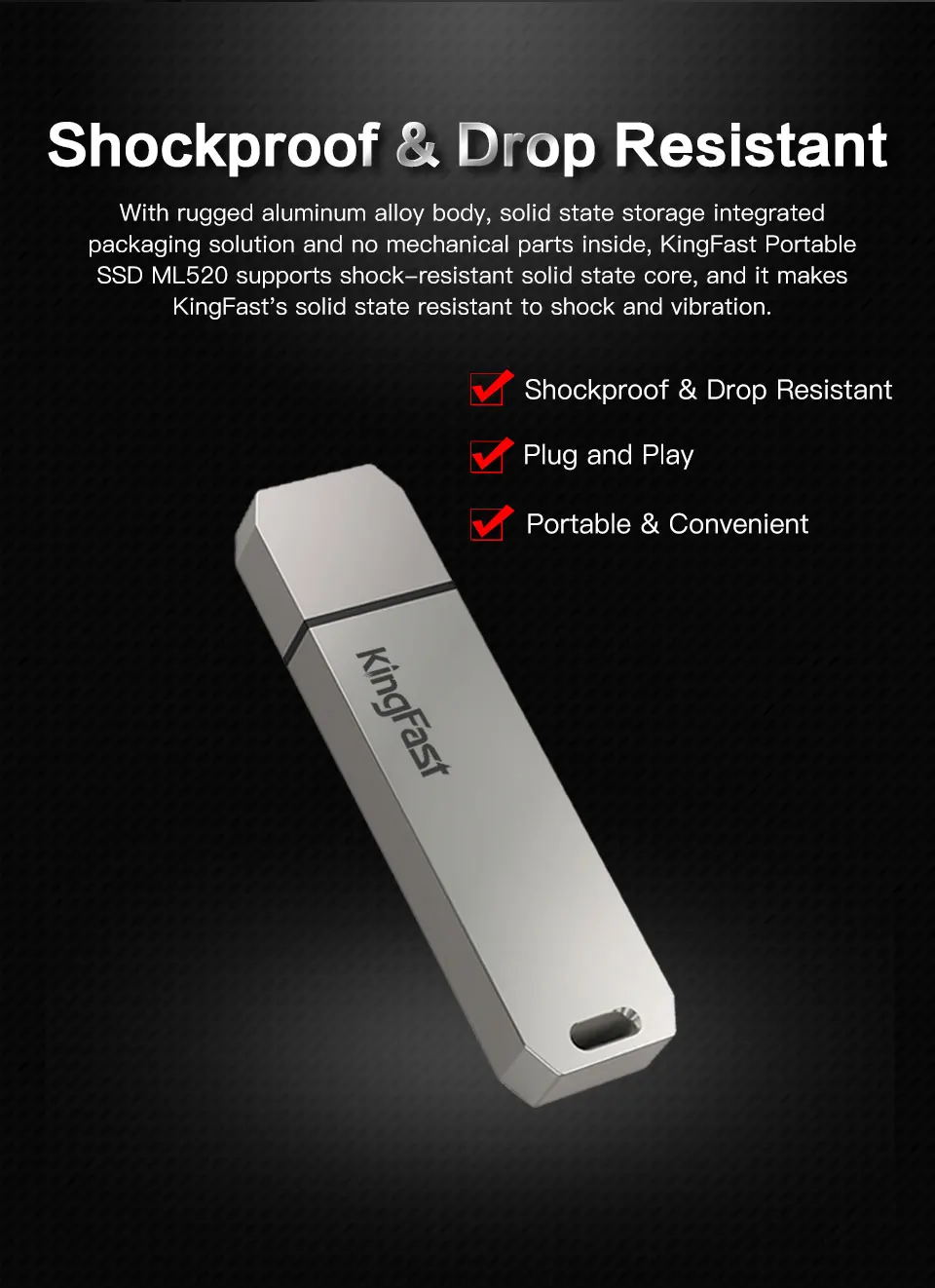 With a rugged aluminum alloy body, solid-state storage integrated packaging solution, and no mechanical parts inside, KingFast Portable SSD ML520 supports a shock-resistant solid-state core, and it makes KingFast’s solid state resistant to shock and vibration.